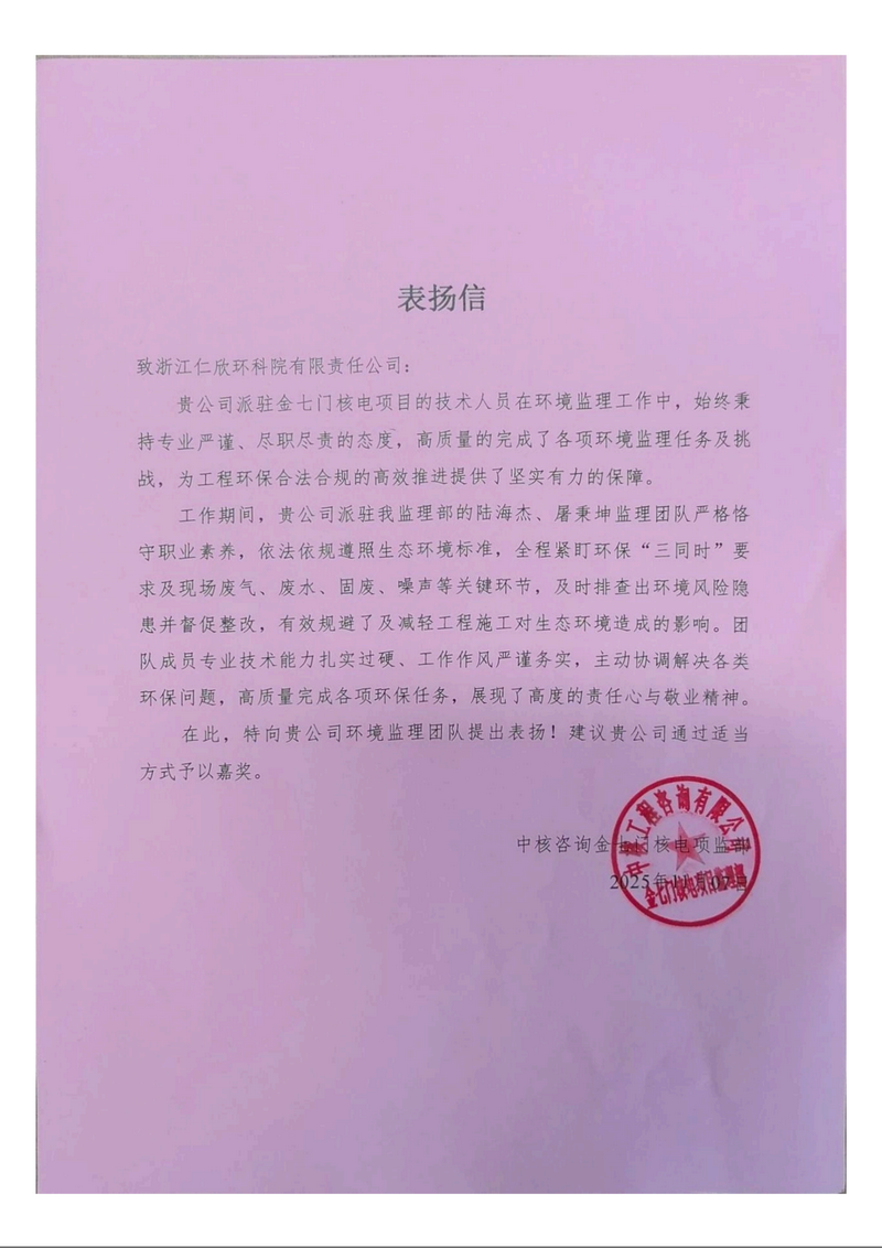 仁欣环科院环境监理团队获中核咨询表扬信