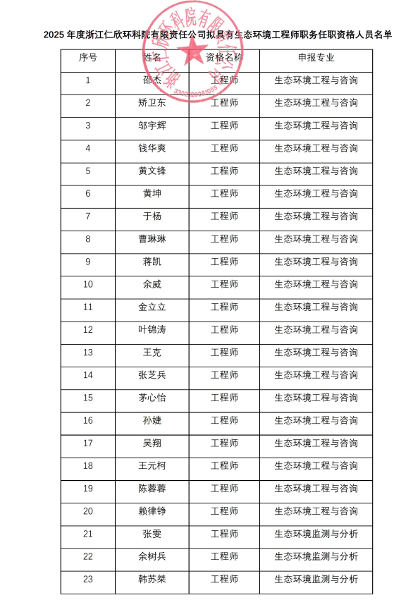 关于2025年度浙江仁欣环科院有限责任公司生态环境专业工程师职务任职资格评审结果的公示